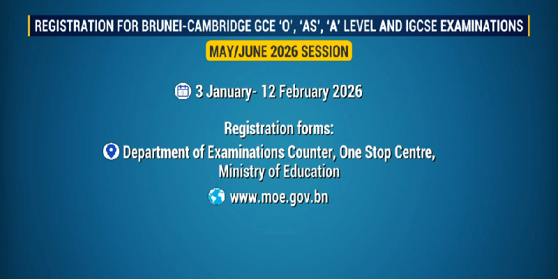 Registration for the Brunei-Cambridge GCE 'O', 'A' Level and IGCSE Examinations May/June 2026 SessionThe Ministry of Education through the Examinations Department will open the registration for Brunei-Cambridge GCE 'O', 'AS', 'A' Level and IGCSE Examinations for May/ June 2026 session on the 3rd of January to 12th of February 2026.