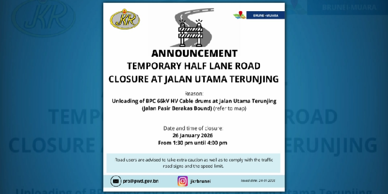 Temporary Half Lane Road Closure at Jalan Utama TerunjingHalf of the main road in Terunjing will be temporarily closed, on 26th January, Monday, starting from 1:30 to 4:00 in the afternoon.