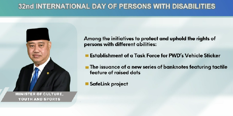 Message in conjunction with 32nd International Day of Persons with DisabilitiesBrunei Darussalam through the Whole-of-Nation approach remains actively committed to protecting and upholding the rights of persons with different abilities. This was highlighted by the Minister of Culture, Youth and Sports in a message in conjunction with the 32nd International Day of Persons with Disabilities.