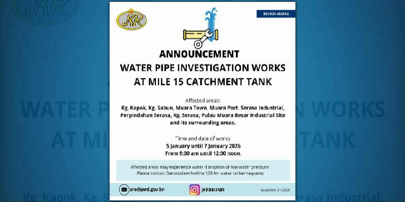 Water Pipe Investigation Works at Mile 15 Catchment TankSeveral areas in the Brunei Muara District may experience water disruption or low water pressure due to water pipe investigation works at Mile 15 Catchment Tank. The disruption will start on the 5th of January until the 7th of January, from 9 in the morning to 12 in the afternoon.