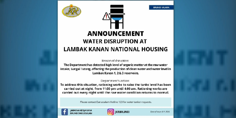 Water Disruption at Lambak Kanan National HousingThe quality of Sungai Tutong's raw water contains very high levels of organic matter, affecting the production of clean water and directly affecting the levels of the Lambak Kanan 1, 2 and 3 reservoirs.