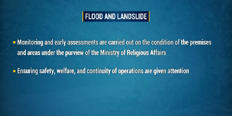 Flood and LandslideSeveral schools, mosques, and cemeteries under the purview of the Ministry of Religious Affairs were affected by landslides following continuous rain that triggered floods and landslides. Among the affected areas was the Luagan Kelompang Islamic Cemetery in Kampung Sinaut, Tutong District. Following the incident, the Fire and Rescue Department, the National Disaster Management Centre, and the Tutong District Office under the Ministry of Home Affairs; together with the Public Works Department, Ministry of Development; and the Building and Maintenance Division, Ministry of Religious Affairs, were at the site to assess the affected areas.