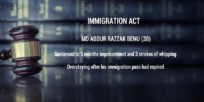 Immigration ActA Bangladeshi man was sentenced for an offence under the Immigration Act, Chapter 17, namely overstaying in the country after his immigration pass had expired.