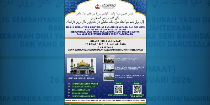 National Level Isra' Mi'raj Celebration 1447 HijrahIsra' Mi'raj is a great event that Allah Subhanahu Wata'ala bestowed upon Prophet Muhammad Shallallahu 'Alaihi Wasallam. To commemorate the great event which falls on every 27th of Rejab, Brunei Darussalam will hold the National Level Isra' Mi'raj Celebration 1447 Hijrah on Saturday, 27th Rejab 1447 Hijrah corresponding to the 17th of January 2026, from 9 in the morning, at the Plenary Hall, International Convention Centre in Berakas. With the theme 'Sembahyang Teras Modal Insan Cemerlang', the celebration included the reading of Al-Qur'an verses, Tadabbur and recitation of selawat. It is jointly-organised by the Ministry of Religious Affairs, Ministry of Foreign Affairs, Ministry of Health and Progresif Sendirian Berhad.